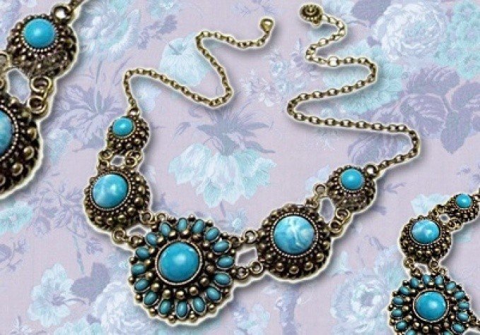 Vintāžas stila kaklarota patiks ikvienai modes dāmai, kas ciena patiesi skaistas vērtības. Lielajiem, tirkīza zilajiem bižutērijas rotājumiem ir senatnīgs pamatīgums – tā būs izcila dāvana mammai, sievai, māsai un ikvienai apburošai dāmai.