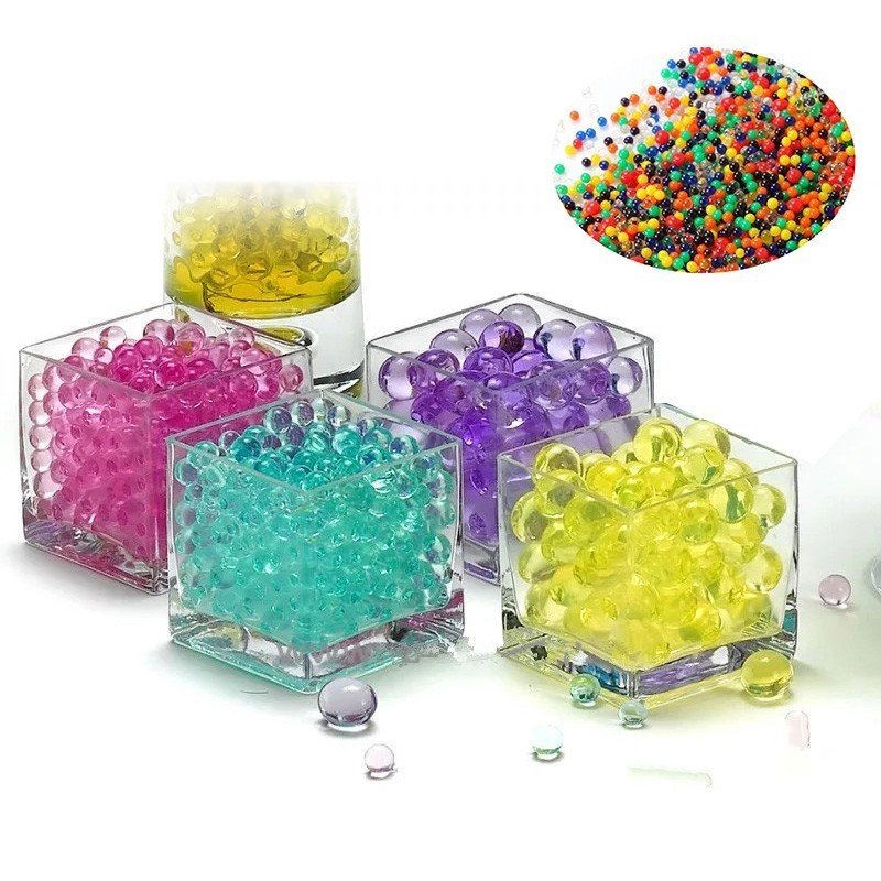 Katrs iepakojums satur 3 gr. 10 gr. vai 20 gr. krāsainās akvagrunta bumbiņas: dzeltenas, sarkanas, oranžas, caurspīdīgas, zilas, violētas un zaļas. Jūs varat sadalīt akvagrunta bumbiņas pēc krāsām un salikt vāzē dažādos krāsās slāņos.